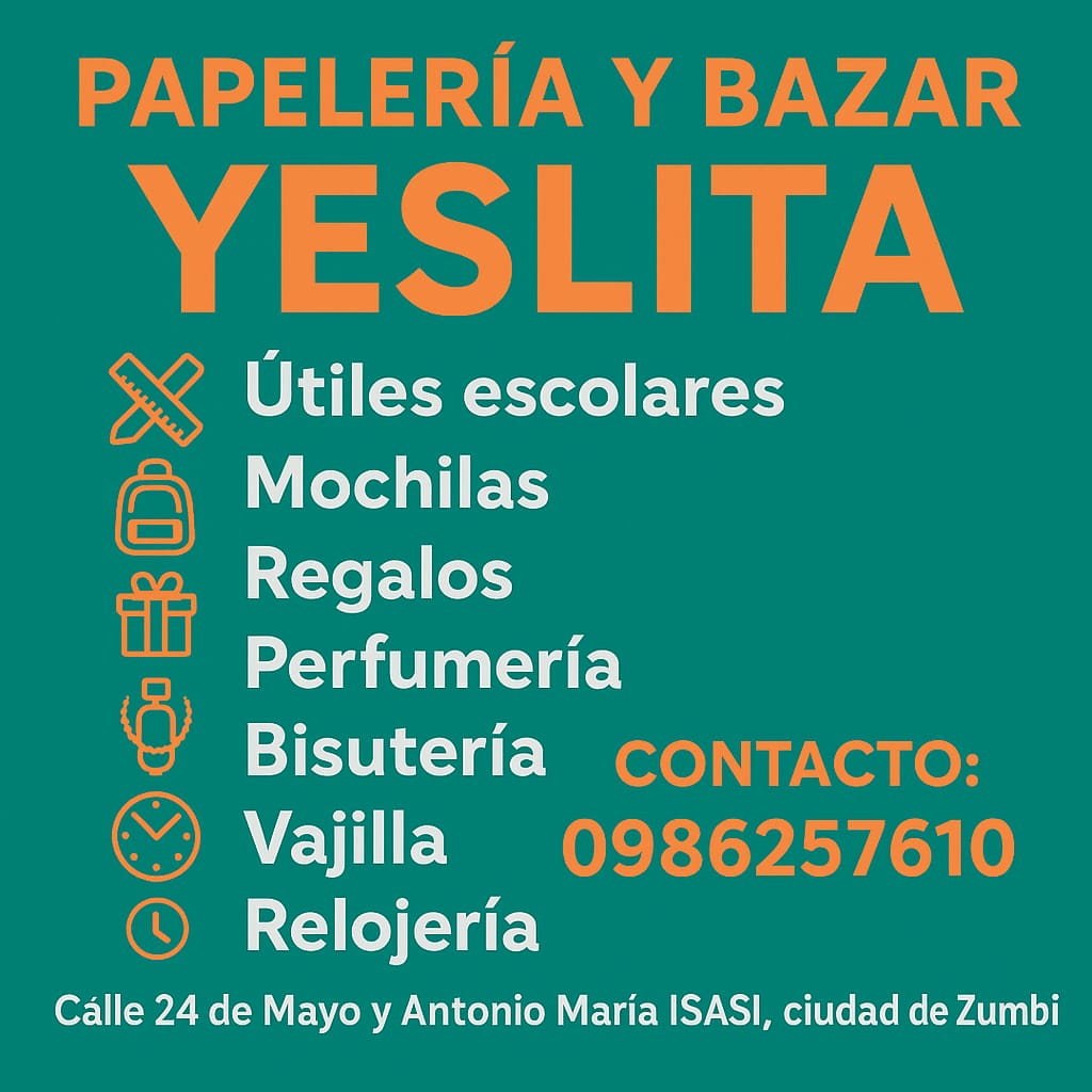 📍 Dirección: Calle 24 de Mayo y Antonio María Isasi, ciudad de Zumbi.
