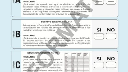 Los ecuatorianos recibirán una sola papeleta donde constará las cuatro preguntas: tres de referéndum y una de consulta popular.