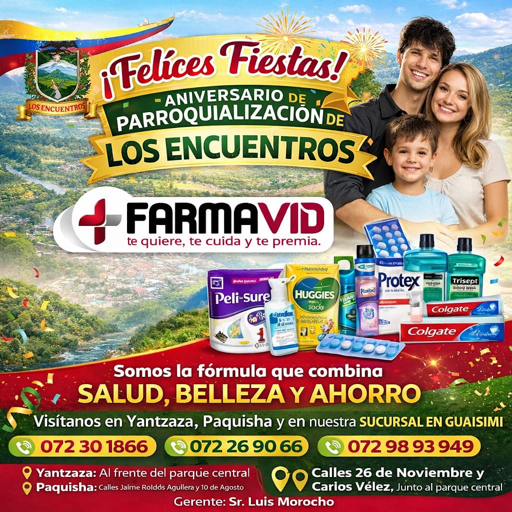 Farmacia Farmavid se une con orgullo a la celebración del aniversario de parroquialización de Los Encuentros, augurando progreso, bienestar y desarrollo para todas sus familias. En esta fecha especial reafirmamos nuestro compromiso con la salud de la comunidad, siendo la única fórmula que combina salud, belleza y ahorro. En Farmavid encuentras medicamentos de las mejores marcas y laboratorios, productos de belleza y consejos saludables, con atención inmediata de personal capacitado. Visítanos en nuestra matriz frente al parque central de Yantzaza, en Paquisha y en nuestra nueva sucursal en Guaisimi.