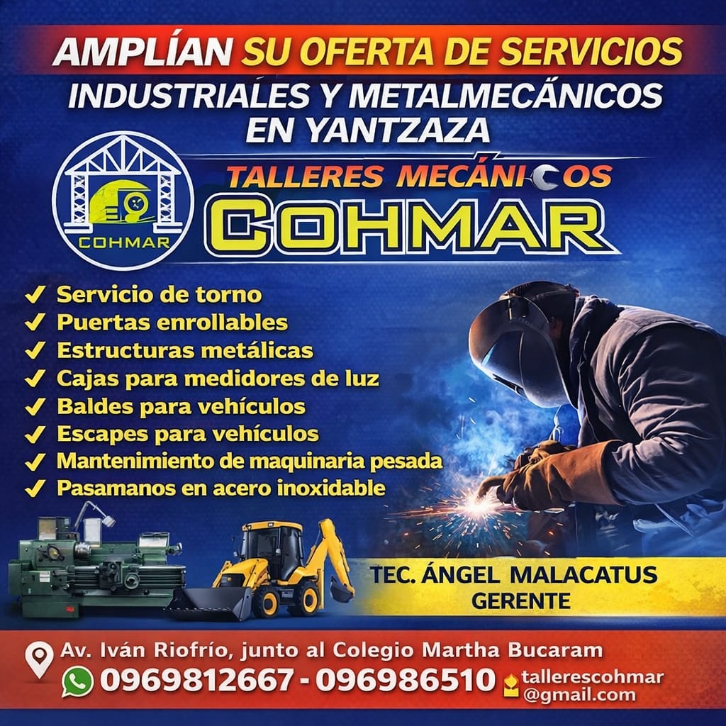 Yantzaza, Ecuador. – Con una propuesta orientada al sector industrial, automotriz y de la construcción, Talleres Mecánicos COHMAR fortalece su presencia en la localidad ofreciendo una amplia gama de servicios especializados en metalmecánica y mantenimiento de maquinaria pesada.